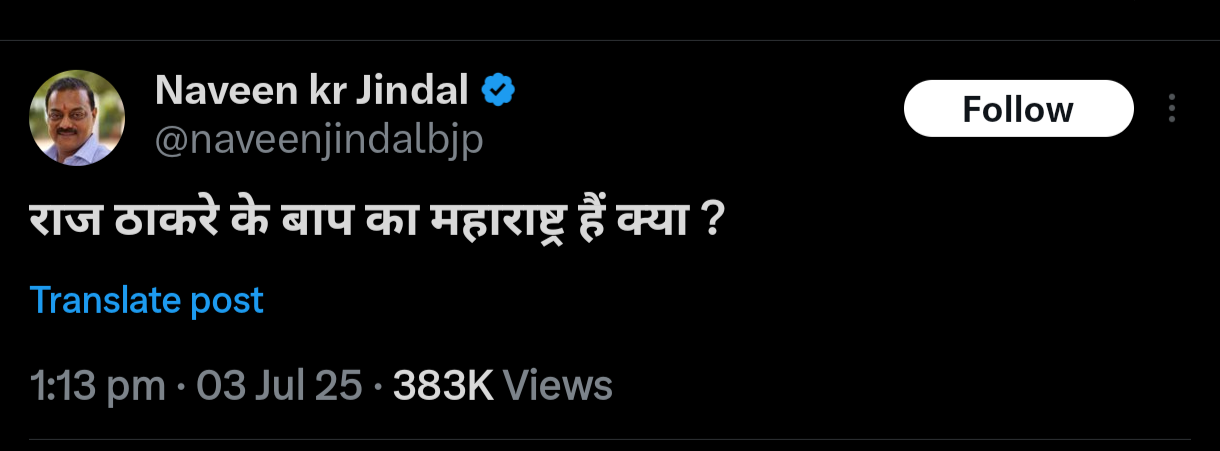नवीन जिंदल का यह ट्वीट अब हिंदीभाषियों के सम्मान और अधिकार की आवाज़ बनता जा रहा है।
