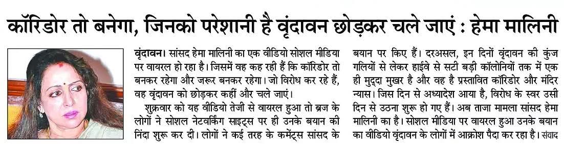 हेमा मालिनी की यह भाषा बताती है कि अब सांसद आम जन की प्रतिनिधि नहीं, बल्कि रियल एस्टेट विकास के पक्षधर बन चुके हैं। कितना शर्मनाक है कि वृंदावन जैसे तीर्थ स्थल को एक ‘प्रोजेक्ट’ बना दिया गया है, और जो विरोध करे, उसे शहर छोड़ने की सलाह दी जाती है!