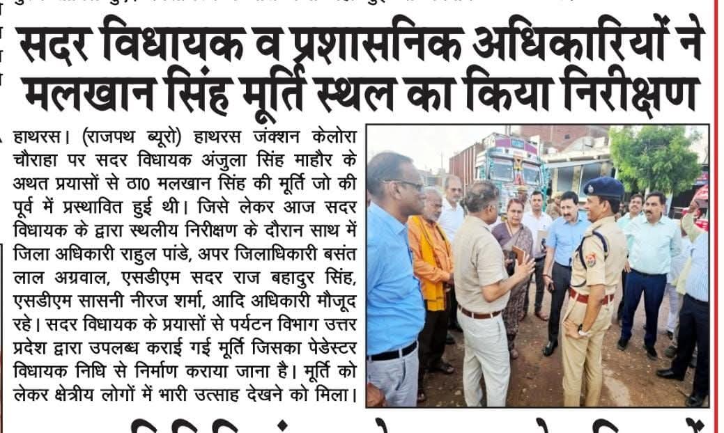 हाथरस की राजनीति अब विकास या जनसेवा पर नहीं, मूर्ति स्थलों पर केंद्रित होती जा रही है। ताजा मामला है ठाकुर मलखान सिंह जी की मूर्ति, जिसे सदर विधायक अंजुला सिंह माहौर के अथक प्रयासों से फिर से स्थापित किया जा रहा है। इस पर निरीक्षण में पूरा प्रशासन जुट गया — जिलाधिकारी से लेकर एसडीएम, एसपी तक, जैसे कोई राष्ट्रीय परियोजना हो!