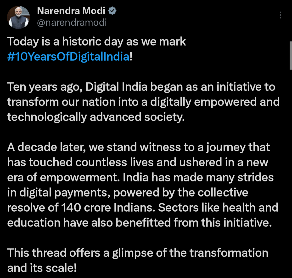 नई दिल्ली, 1 जुलाई – साल 2015 में प्रधानमंत्री नरेंद्र मोदी द्वारा शुरू की गई डिजिटल इंडिया योजना ने आज 10 गौरवशाली वर्ष पूरे कर लिए हैं। इस ऐतिहासिक अवसर पर MyGovIndia के ट्विटर हैंडल पर साझा की गई तस्वीरों ने इस योजना की अद्भुत उपलब्धियों को सामने रखा।
